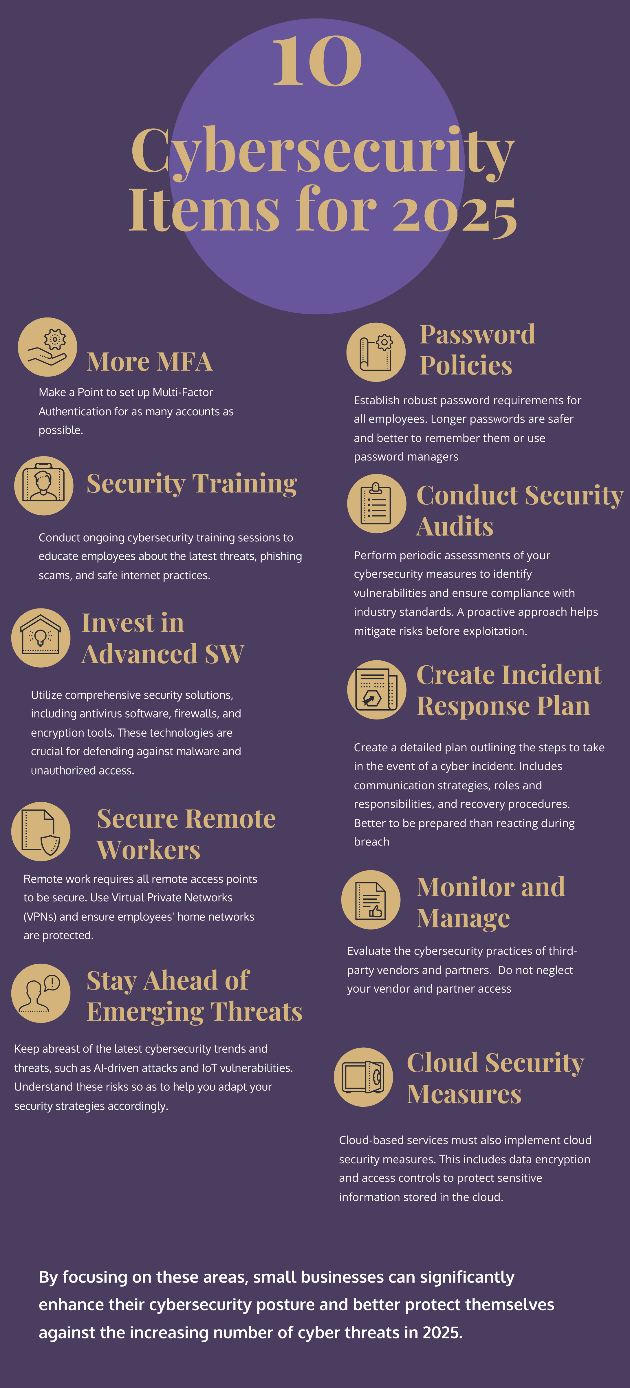 As we approach the new year, small businesses should prioritize their cybersecurity strategies to protect against evolving threats. Here are 10 essential items to work on for 2025:
