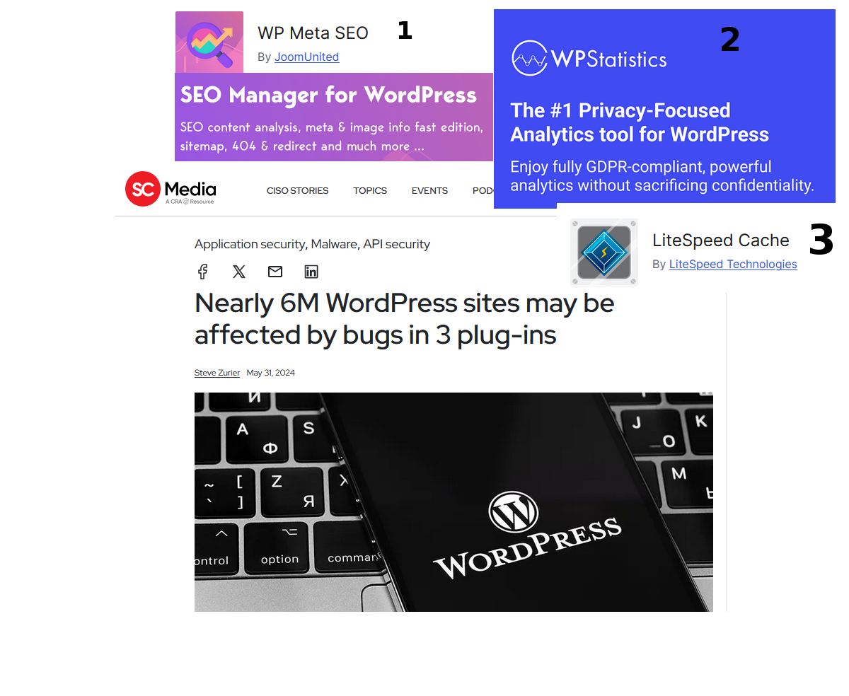 Another Article (SCMagazine) with more bugs that can cause cybersecurity incidents – WordPress Plugins WPMeta SEO, WPStatistics, and LiteSpeed Cache.