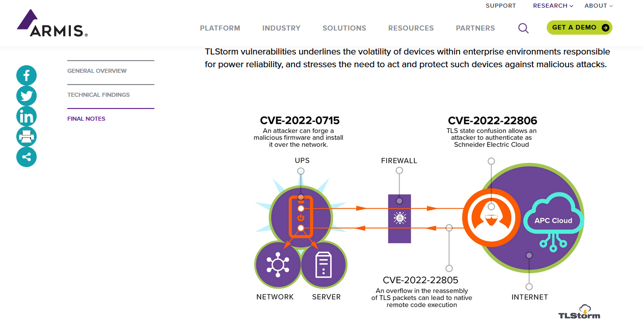 The set of discovered vulnerabilities include two critical vulnerabilities in the TLS implementation used by Cloud-connected Smart-UPS devices, as well as a third critical vulnerability, a design flaw, in which firmware upgrades of all Smart-UPS devices are not properly signed and validated.