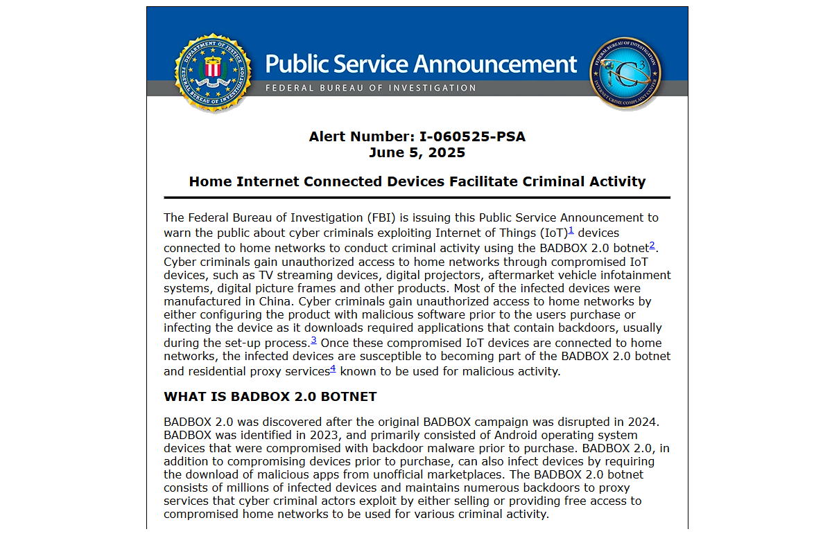 ## Consumer Entertainment Devices 1. **TV Streaming Devices / Connected TV (CTV) Boxes** - Particularly vulnerable when they are low-cost or off-brand devices - Most commonly affected when not Play Protect certified - Often come with pre-installed malware during manufacturing 2. **Digital Projectors** - Especially those with internet connectivity features - Vulnerable to infection through their network connections 3. **Digital Picture Frames** - Internet-connected models that can download and display images - Particularly susceptible when from less reputable manufacturers ## Mobile and Smart Devices 1. **Android Devices** - Particularly those manufactured and shipped from China - Devices that are not Google Play Protect certified - Specifically vulnerable when running Android Open Source Project (AOSP) 2. **Specific Brand Devices** - Yandex Smart TVs - Hisense Smartphones ## Vehicle Systems 1. **Aftermarket Vehicle Infotainment Systems** - Particularly vulnerable when: - Installed post-manufacture - Sourced from less reputable manufacturers - Advertised as "unlocked" or offering free content # Key Vulnerability Factors Systems are particularly susceptible to Badbox 2.0 when they have the following characteristics: 1. **Manufacturing Origin** - Devices manufactured in China with less stringent security controls - Off-brand or uncertified devices 2. **Device Certification** - Devices that lack Google Play Protect certification - Systems running uncertified versions of Android OS 3. **Distribution Channels** - Devices sold through unofficial or less reputable channels - Systems advertised with suspicious features like "unlocked" or "free content" access 4. **Software Configuration** - Devices that allow sideloading of applications - Systems with outdated or unpatched firmware - Devices that receive updates from unofficial sources The Badbox 2.0 botnet has infected over a million devices across 222 countries, making it the largest botnet of infected CTV devices ever discovered. The malware is particularly effective at compromising devices through supply chain attacks, often being pre-installed during manufacturing or distributed through unofficial app marketplaces. It is wise to ensure only devices that you have vetted to connect to your network. Check out my Security Policies at my Store