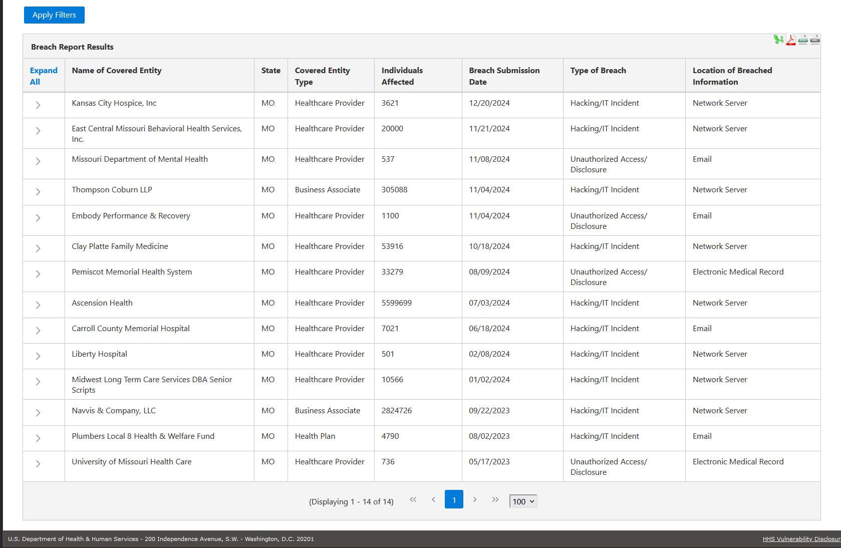 The article just chronicles several breaches and a list of many breaches Here is an image of a few investigations into breaches by HHS in Missouri only (it looks like there are hundreds of investigations across the country)