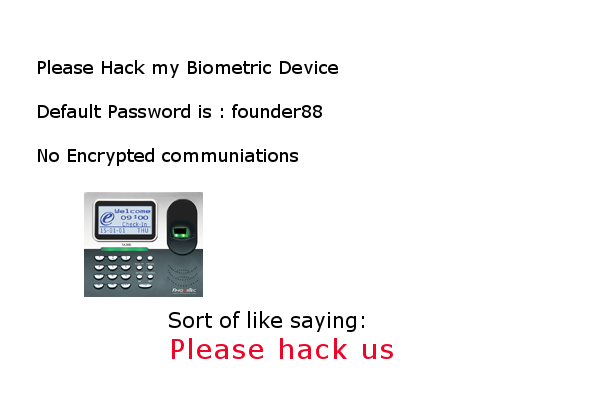 They do not understand the implications of clear text tcp/ip communications by Fingertec. To a seasoned hacker (security professional) the device will take a little effort but can be breached rather quickly. Especially if basic precautions are not kept, like changing default passwords.