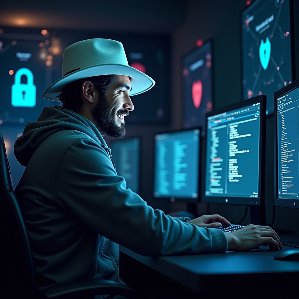 AI Ethics — Regulations — Best Practices — all of these should be reviewed and worked on before not after events happen. The main picture is a white hat hacker working away on his computer.